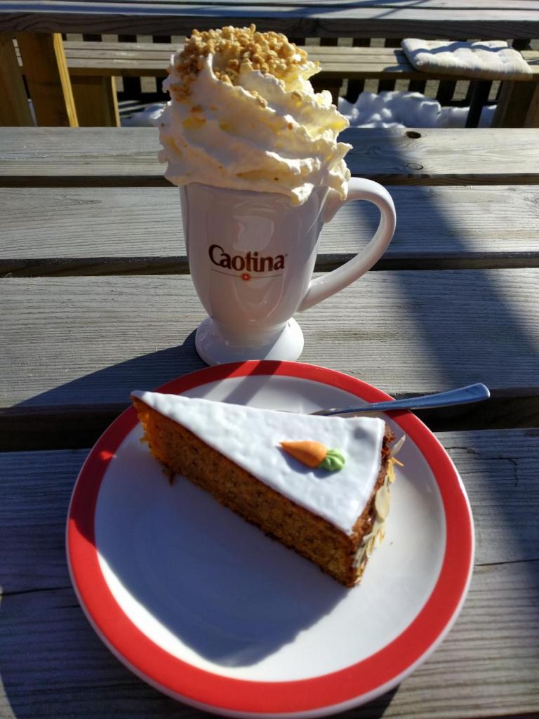 Muonion Swiss Cafén terassilla nauttimani porkkanakakun viipale ja reilulla kermavaahdolla kuorrutettu tummasuklaakaakao maistuivat erityisen herkullisilta aivan liian pitkän kahvilatauon jälkeen.